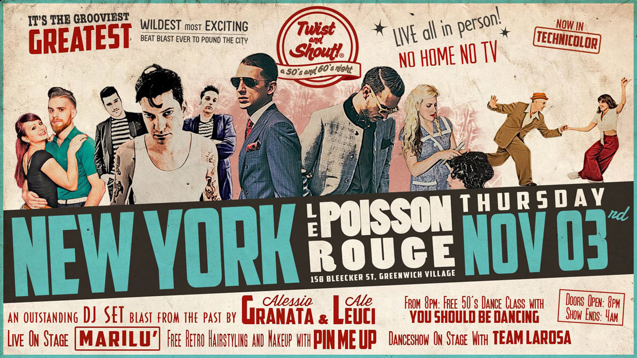 ★ Spinning the records: Monsieur ALESSIO GRANATA and Monsieur ALE LEUCI are ready to entertain you throughout the night with their special selection of rock ‘n’ roll, fifties, sixties, swing, rhythm and blues, garage, beat, doo wop, American, English and Italian Graffiti, boogie- woogie, twist, shout, loud, the soundtracks of the most exciting couple of decades of all times. This same sound has been sending the Italians nuts recently causing them to shake their hips.