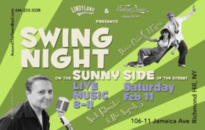 Lindyland & Vintage Dance presents: SWING NIGHT on the SUNNY SIDE of the street. Date: FRI DEC 23, 2022 DANCE LESSON 7:15 with Team LINDYLAND (open to all levels) LIVE MUSIC 8:00 -11:00PM BAND: NICK PALUMBO and his NAPOLI 5 LOCATION: 106-11 Jamaica Ave, Richmond Hill, NY 11418, United States Refreshments and snacks available come…
