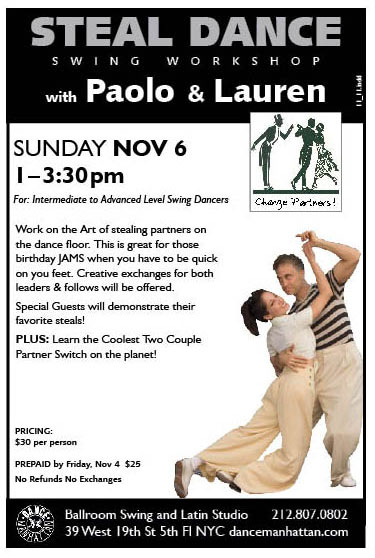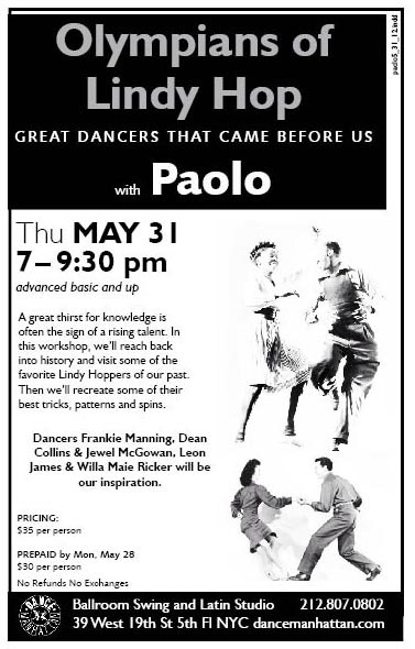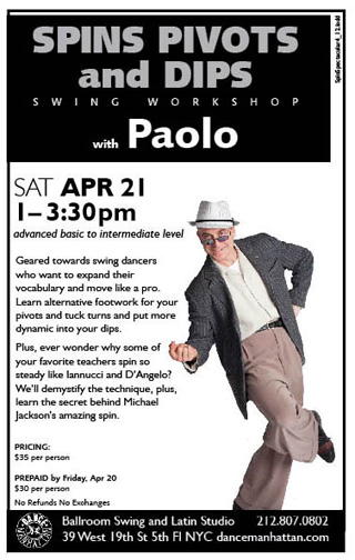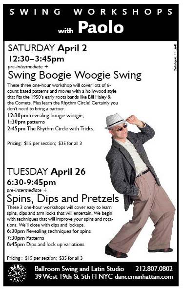 Above Class Location: Dance Manhattan 39 West 19th Street 5th Floor NYC call 212-807-0802 to sign up. note: dance shoes with suede soles are recommended for this class! see link featuring paolo performing this dance: swingremix.com Dance Manhattan 39 West 19th St NYC 212-807-0802