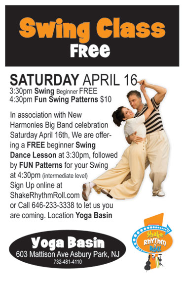 3:30pm Swing Beginner FREE, 4:30pm Fun Swing Patterns $10 In association with New Harmonie Celebration Big Band Night Saturday April 16th, We are offering a FREE beginner Swing Dance Lesson at 3:30pm, followed by FUN Patterns for your Swing at 4:30pm (intermediate level) Please drop us an email to dance@shakerhythmroll.com or Call 646-233-3338 to let us you are coming. Location Yoga Basin 603 Mattison Ave. Asbury Park NJ