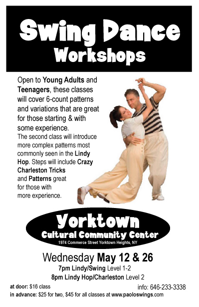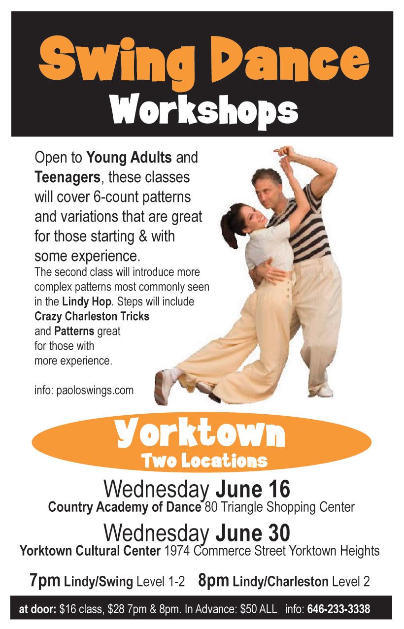 Swing Dance Workshops in Yorktown Friday April 2 only, 2010 Open to Young Adults and Teenagers, these classes will cover 6-count patterns and variations that are great for those starting & with some experience.The second class will introduce more complex patterns most commonly seen in the Lindy Hop. Steps will include Crazy Charleston Tricks and Patterns great for those with more experience. 7pm Lindy/Swing Level 1-2
