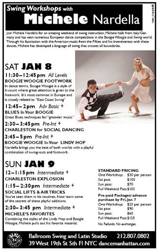 Join Michele Nardella and his partner for an amazing weekend of swing instruction. Michele hails from Italy/Germany and has won numberous European dance competitions in the Boogie Woogie and Swing world. click on photo for larger view. Call 212-807-0802 to sign up. Special deals available with advanced purchase only.